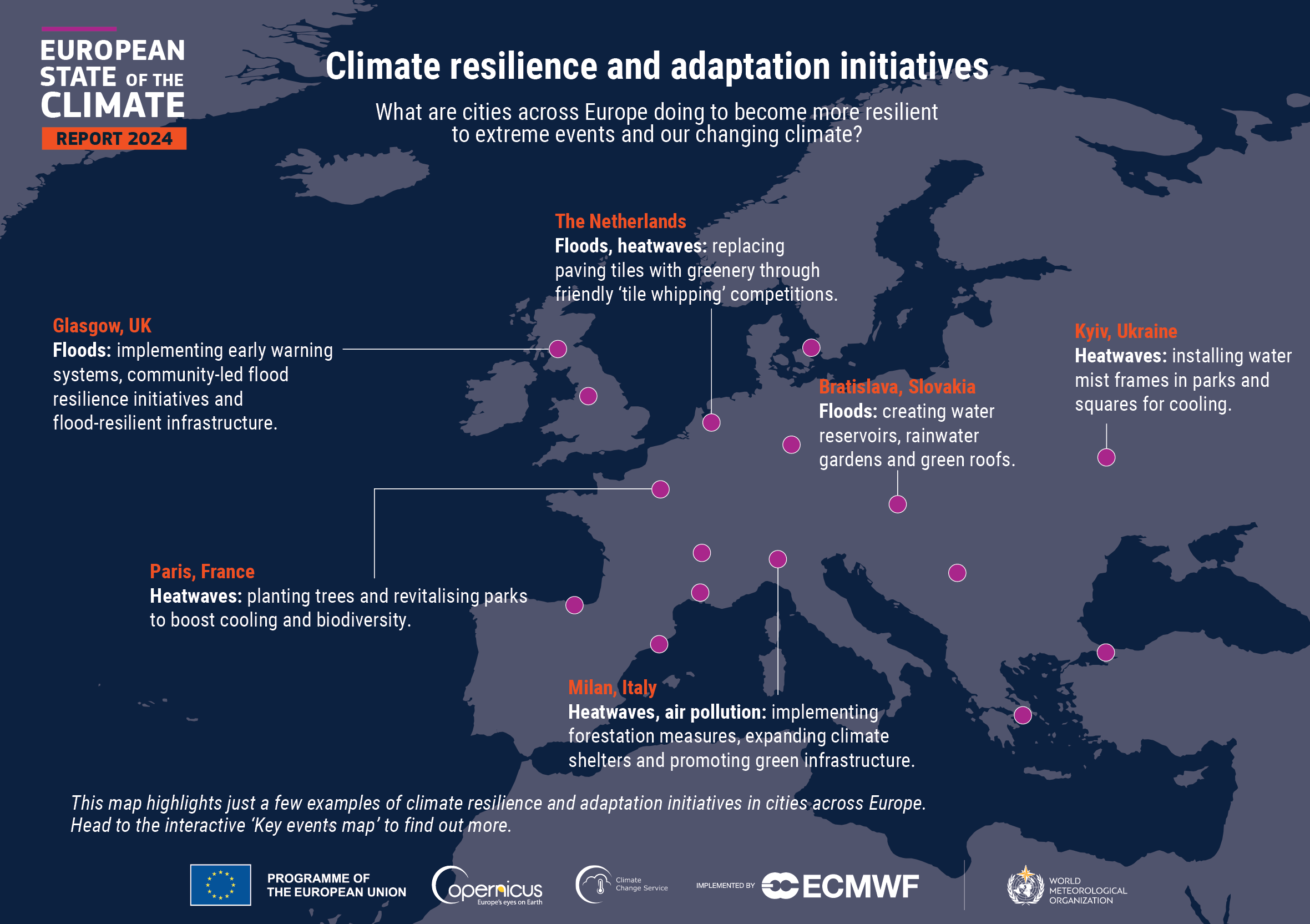 W tym roku interaktywna mapa najważniejszych wydarzeń została wzbogacona o nową warstwę przedstawiającą przykłady działań na rzecz odporności klimatycznej i inicjatyw adaptacyjnych realizowanych w miastach w całej Europie.