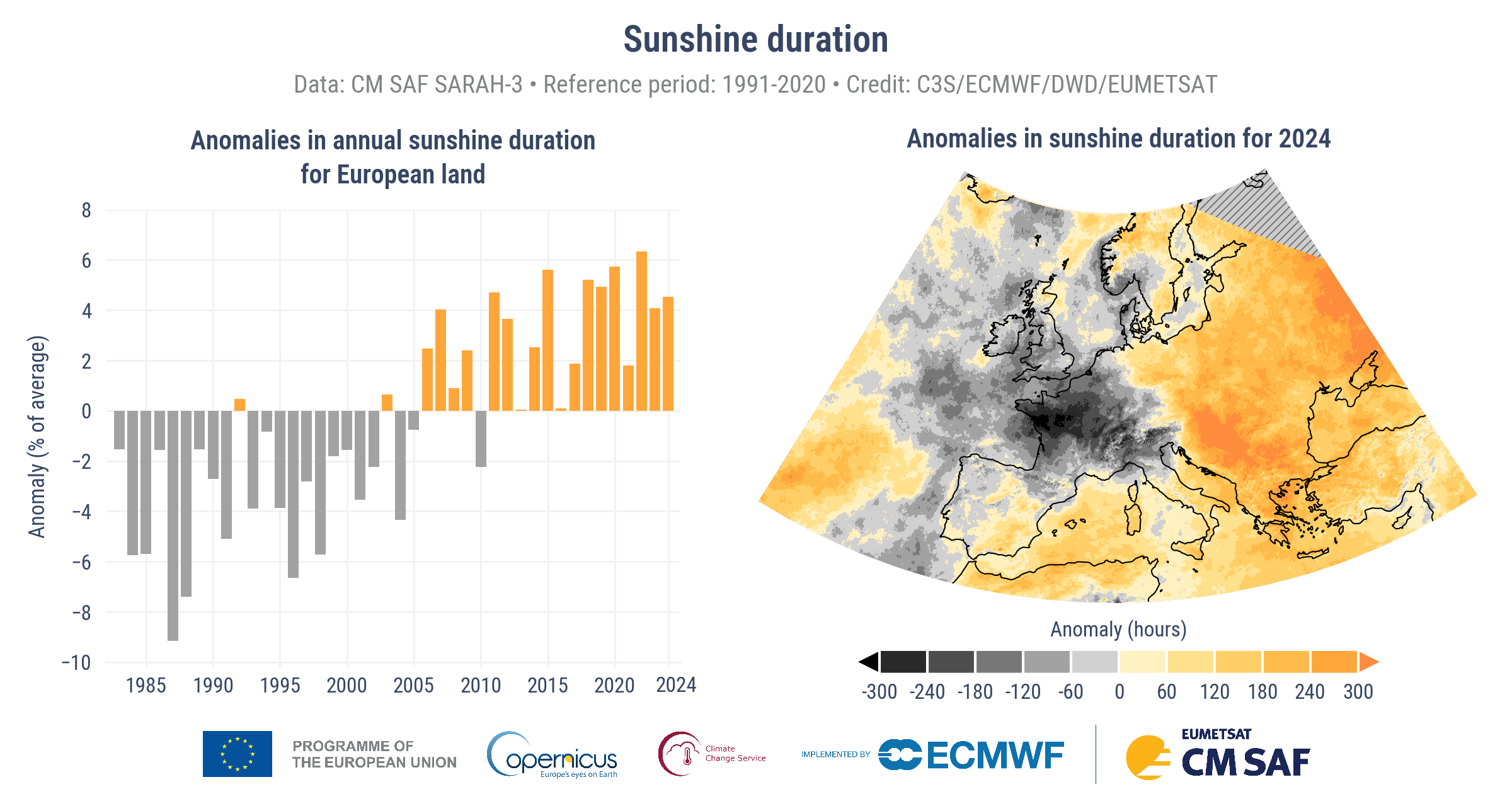 (Po prawej) Anomalie czasu nasłonecznienia (w godzinach) w Europie w 2024 roku, z dodatnimi odchyleniami (odcienie pomarańczowego) i ujemnymi (odcienie szarości). Okres referencyjny: 1991–2020.