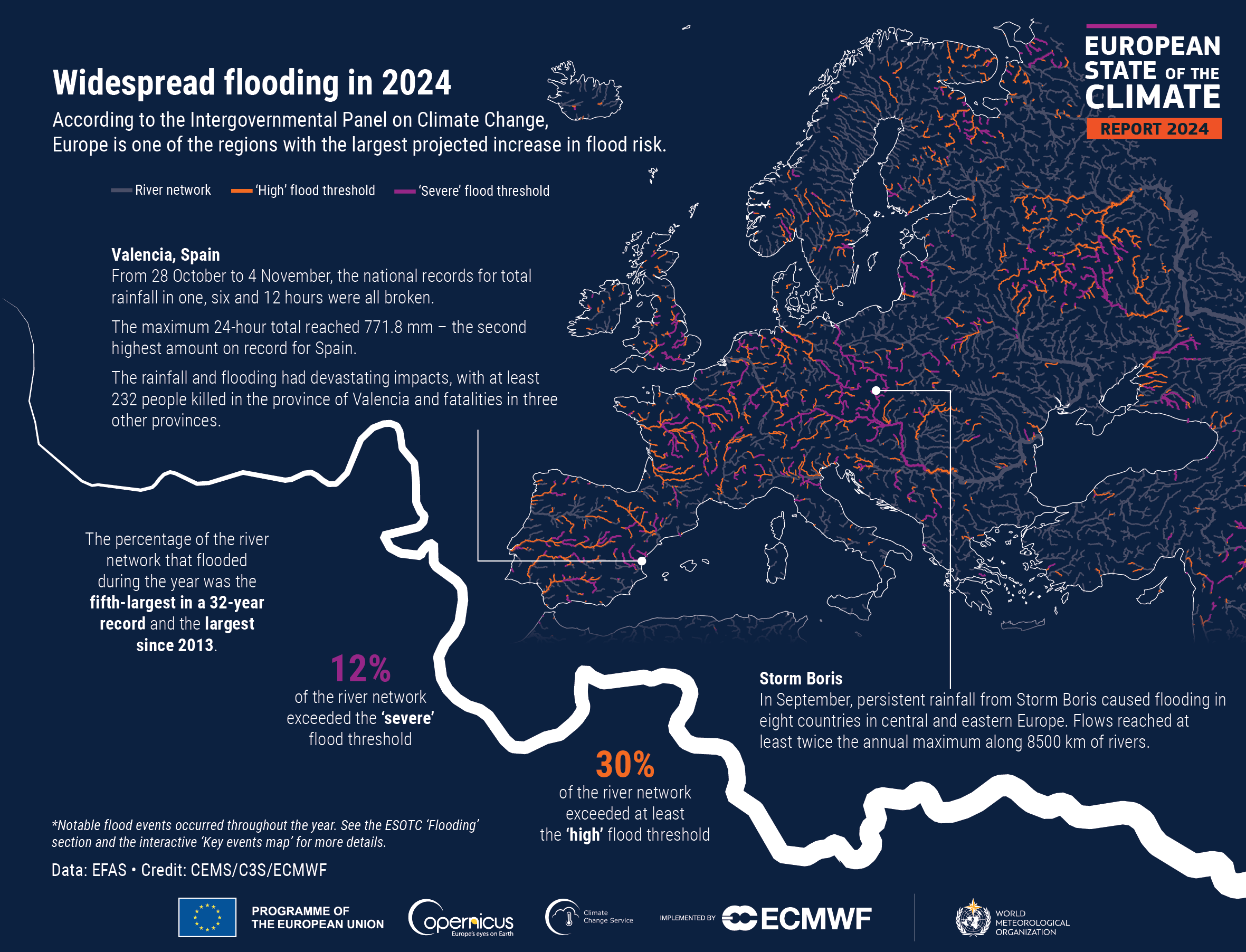 Raport ESOTC 2024 koncentruje się na przeglądzie powodzi w Europie, ze szczególnym uwzględnieniem ekstremalnych zjawisk w Europie Środkowej i Wschodniej związanych z układem niskiego ciśnienia Boris oraz tych, które miały miejsce w Walencji w Hiszpanii, jak również ekstremalnych upałów i suszy w południowo-wschodniej Europie latem.