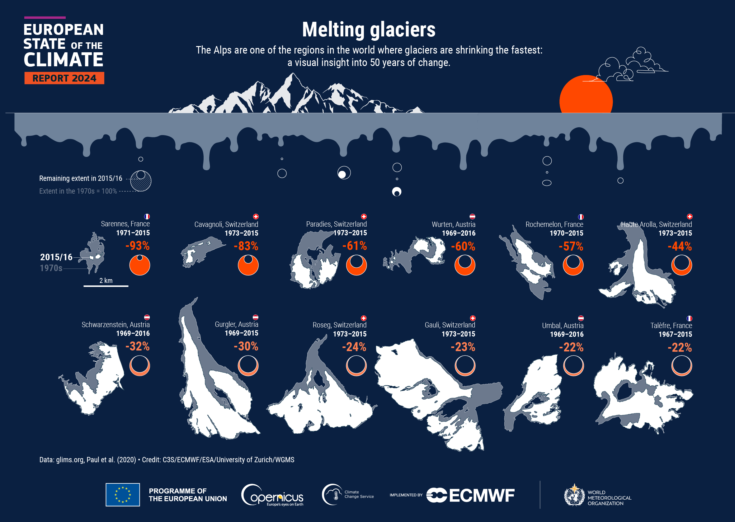 Organizacja Narodów Zjednoczonych ogłosiła 2025 Międzynarodowym Rokiem Ochrony Lodowców. Dane zawarte w raporcie ESOTC 2024 wskazują, że we wszystkich regionach Europy lodowce traciły masę. Europa Środkowa należy do obszarów świata, w których lodowce kurczą się najszybciej – raport zawiera infografikę ilustrującą, jak bardzo zmniejszyły się lodowce alpejskie od lat 70. XX wieku.