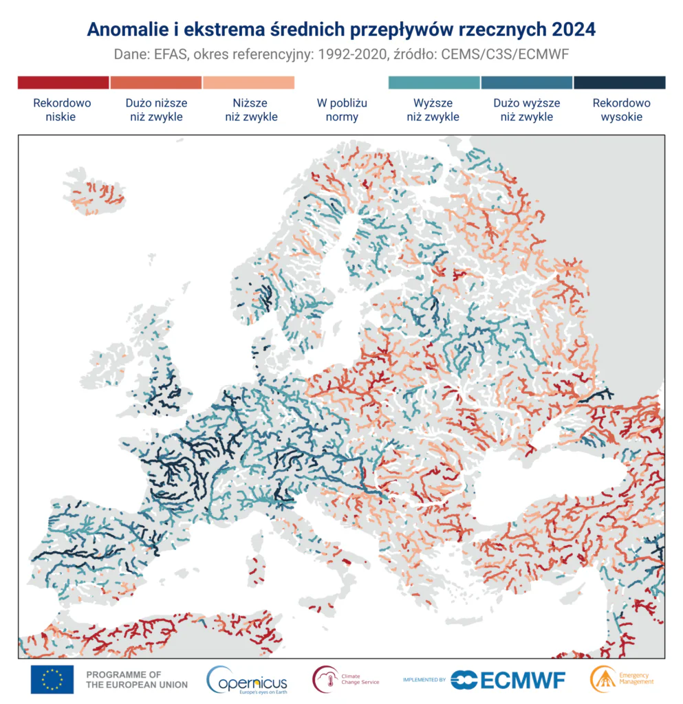 Anomalie i ekstrema w rocznym średnim przepływie rzek w 2024 roku. Okres referencyjny: ekstrema 1992–2024, anomalie 1992–2020. Dane: EFAS. Źródło: CEMS/C3S/ECMWF.
