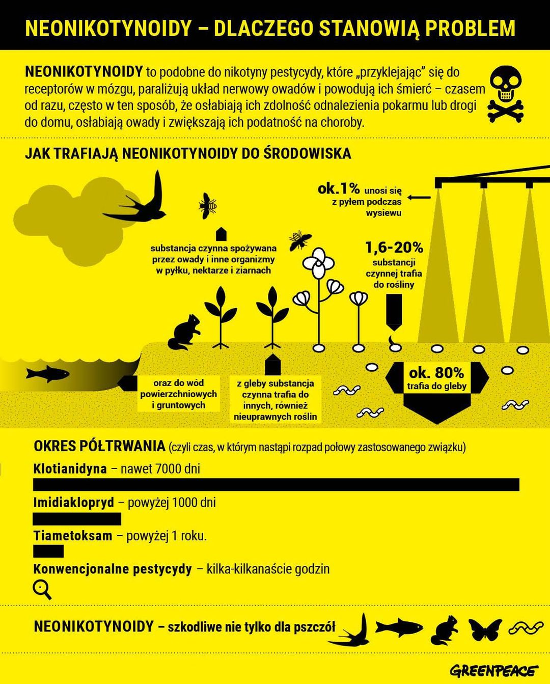 Greenpeace zlecił Uniwersytetowi w Sussex, jednej z najważniejszych instytucji naukowych Wielkiej Brytanii, przeprowadzenie szeroko zakrojonego przeglądu badań naukowych wpływu insektycydów z grupy neonikotynoidów na zapylacze i środowisko w ogóle, których wyniki opublikowano od 2013 roku. Przeprowadzony przegląd potwierdził ryzyko rozpoznane przez EFSA w 2013 roku i umożliwił wykrycie kolejnych zagrożeń dla zapylaczy. Nowe badania wskazują w szczególności, że szkodliwość dla pszczół jest związana nie tylko z poddanymi zabiegom ochronnym roślinami uprawnymi, lecz również z zanieczyszczonymi roślinami dzikimi, wobec których nie stosowano neonikotynoidów. Niedawno uzyskane dane dowodzą ponadto, że neonikotynoidy stały się wszechobecne w środowisku, zanieczyszczając wody, gleby i naturalną roślinność. Uzyskano dowody, że środki te stanowią poważne zagrożenie nie tylko dla pszczół, lecz również dla wielu gatunków dziko żyjących owadów,w tym motyli, chrząszczy i owadów wodnych, pośrednio wywierając szkodliwy wpływ również na organizmy na wyższych poziomach łańcucha pokarmowego.