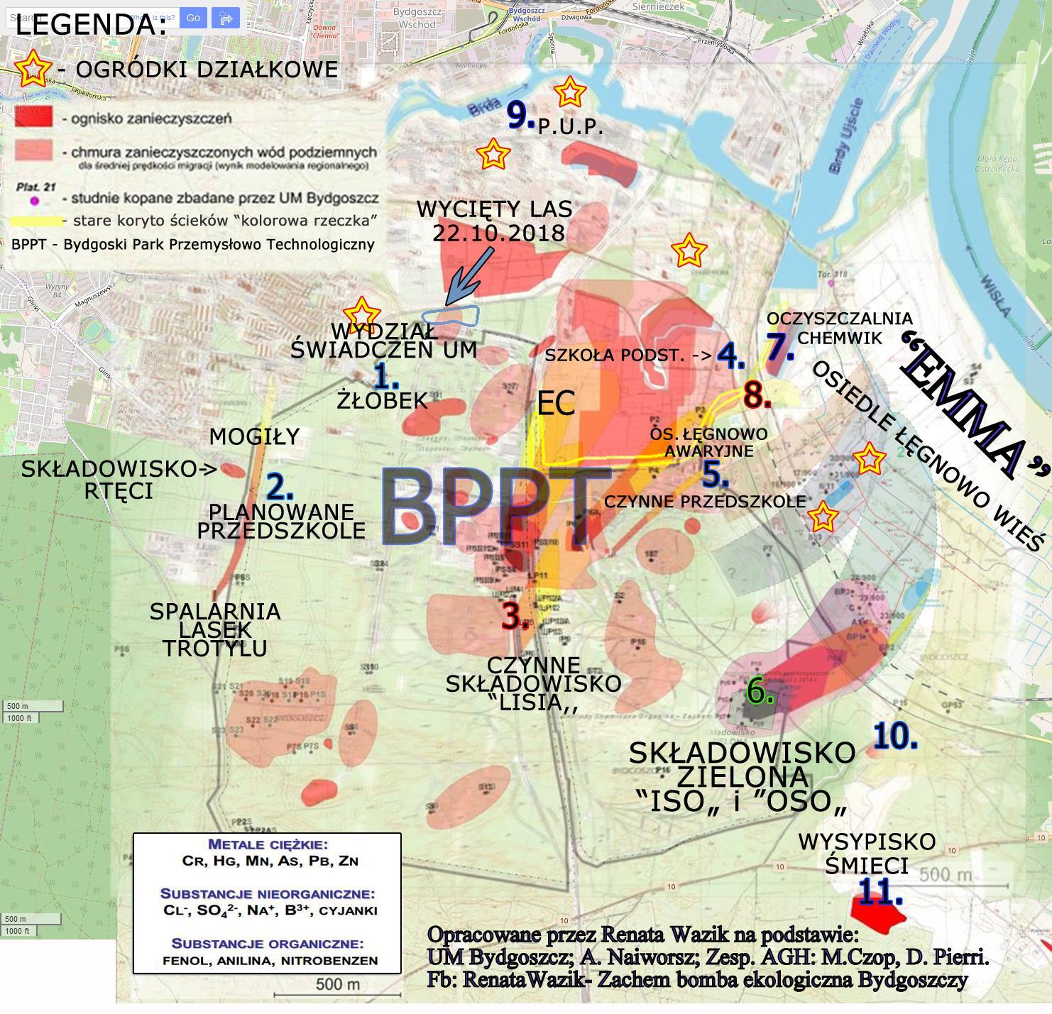 Mówiąc wprost, poza przysłowiową tablicą Mendelejewa na terenach po Zachemie może być jeszcze wiele związków chemicznych, nawet nie znanych współczesnej nauce, które powstały poprzez różne niekontrolowane procesy chemiczne. Nie wiem, czy kiedykolwiek ktoś będzie w stanie zbadać tak do końca, co tu jest… Z badań przeprowadzonych choćby przez Urząd Miasta Bydgoszcz z dotacji UE w r. 2018 wiem, że w wysłanych do londyńskiego laboratorium próbkach wody podziemnej nie można było ustalić granicy końcowej AOX (grupa szkodliwych związków chemicznych). Pracownik Urzędu Miasta oświadczył to przedstawicielom organów, ale moim współmieszkańcom nikt tej informacji nie przekazał wprost. W dokumentach oficjalnych też nie dostrzegam tej informacji, jedynie w raporcie z badań, ale kto to czyta poza mną? Z niezależnych badań, prowadzonych przez zespół prof. Akademii Górniczo-Hutniczej Mariusza Czopa na terenie mojego osiedla w r. 2017, wynika, że w wodach podziemnych, powierzchniowych, w przydomowych studniach używanych powszechnie w gospodarstwach domowych czy do nawadniania tych terenów wykryto gigantyczne przekroczenia wielu związków organicznych, takich jak fenol, anilina, toluidyna, WWA – czyli wielopierścieniowe węglowodory aromatyczne z których wiele podejrzewanych jest lub ma udowodnione własności rakotwórcze.