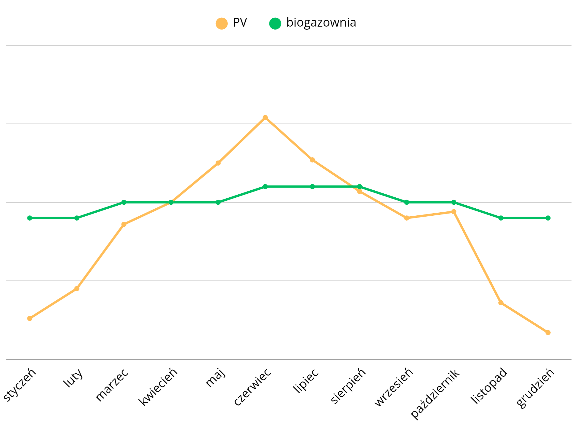 Warto wspomnieć, iż produkcja energii z biogazu nie jest uzależniona od pogody, tak jak ma to miejsce w przypadku energii słonecznej i wiatru. Większość udziału w polskim miksie energetycznym w przypadku odnawialnych źródeł energii ma energia z fotowoltaiki. Jest to sytuacja utrudniająca stabilną pracę systemu energetycznego, w którego podstawie są niesterowalne elektrownie węglowe. Sposób pracy instalacji biogazowej łączy stabilność bliższą elektrowniom konwencjonalnym, gdyż pracuje przez ok. 90% roku, oraz elastyczność, dzięki możliwości czasowego magazynowania biogazu w komorze fermentacyjnej. Biogazownię można prowadzić w tzw. systemie szczytowym. Biogaz jest magazynowany w ciągu dnia, a silnik zostaje włączony w nocy oraz w krótsze pochmurne dni. Umożliwia to dopasowanie profilu produkcji energii z biogazu do profilu produkcji energii ze słońca.