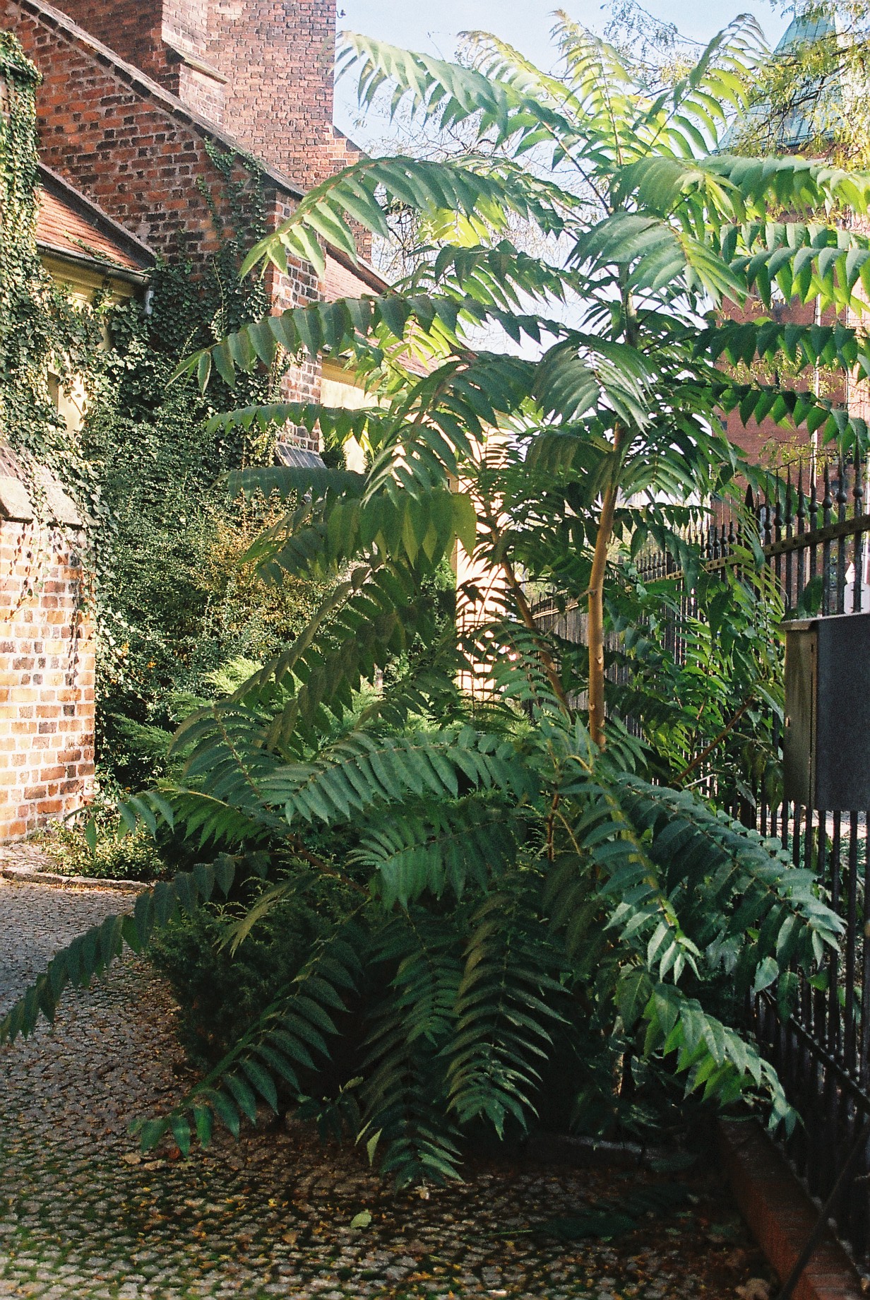 Drzew, które stają się gatunkami inwazyjnymi, jest więcej. We Wrocławiu w tysiącach miejsc można już napotkać grupki starych i młodych egzemplarzy sprowadzonego z Azji drzewa zwanego bożodrzewem Ailanthus altissima. Czterdzieści lat temu widywało się go rzadko. Jego malownicze kilkunastoletnie egzemplarze wyróżniają się imponującymi liśćmi typu pierzastego (Fot.1), budząc skojarzenie z palmami. Taki liść dochodzi do 1,5 m długości, znacznie przewyższając również pierzaste liście orzecha włoskiego. Dojrzały bożodrzew ma liście mniejsze, za to jego gałęzie bywają obsypane pękami brązowiejących nasion podobnych do skrzydlaków jesionu. Dziś przy Moście Uniwersyteckim we Wrocławiu bożodrzewy tworzą wręcz aleję (Fot.2), a dalsze owocujące egzemplarze rosną na wielu sąsiednich podwórkach. Także w dzielnicy Śródmieście ten „najeźdźca” rozrasta się bujnie w setkach miejsc, kiełkując nawet w studzienkach okien piwnicznych lub przy ścianach budynków na zwałach tynku.
