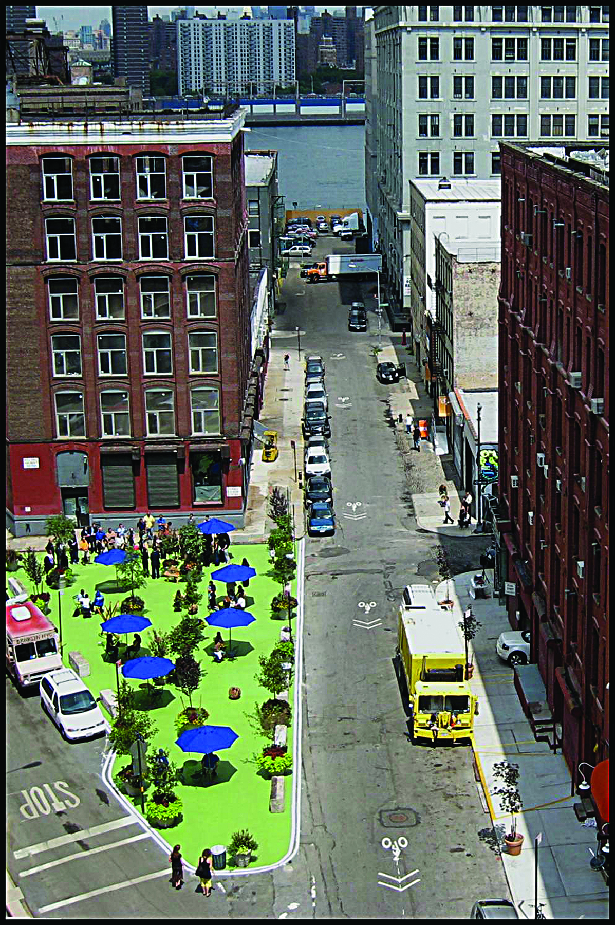 Powyżej: Pearl Street. Pierwsza interwencja Sadik-Khan (2007) – skwer utworzony kosztem słabo wykorzystanych miejsc parkingowych. Fot: NYC DOT Ryan Ruso