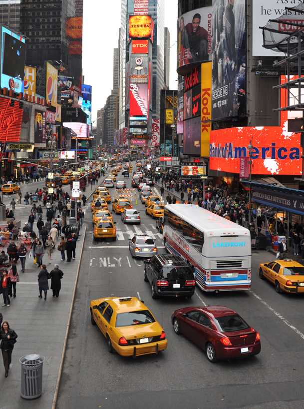 Powyżej: Times Square. Odebranie przestrzeni samochodom i przekazania mieszkańcom stało się symbolem zmian w Nowym Jorku. Widoczna na zdjęciu tymczasowa aranżacja przetarła drogę do przebudowy. Fot: NYC DOT Heidi Wolf, Julio Palleiro