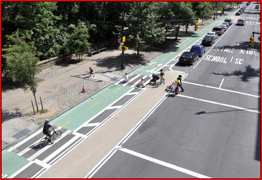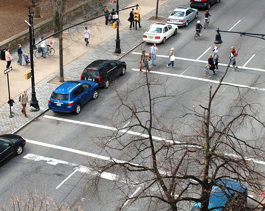 Powyżej: Prospect Park (przed i po). Trasa rowerowa utworzona poprzez zmniejszenie liczby pasów ruchu i przesunięcie pasa do parkowania. Fot: NYC DOT Julio Palleiro, Nick Carey