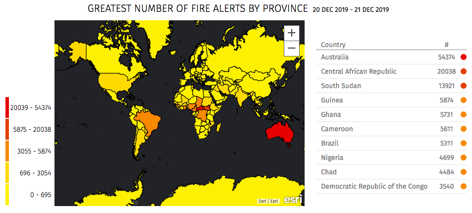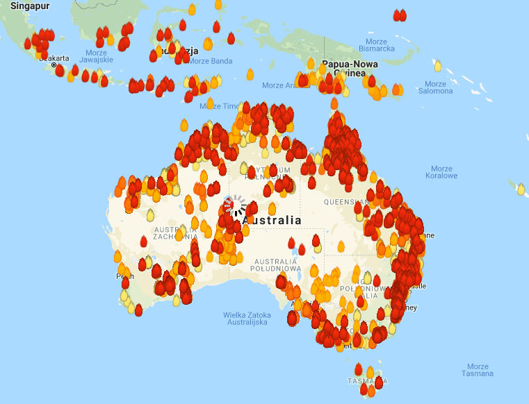 Na mapie satelitarnej ze strony rządowej widoczne są pożary na terenie całego kraju. Australijskie Biuro Meteorologiczne (BOM) podało, że w tym tygodniu średnia wartość maksymalnej temperatury sięgnęła 40,9 stopni Celsjusza. Susze i pożary buszu ogarniają coraz większe połacie na południu i południowym wschodzie Australii.