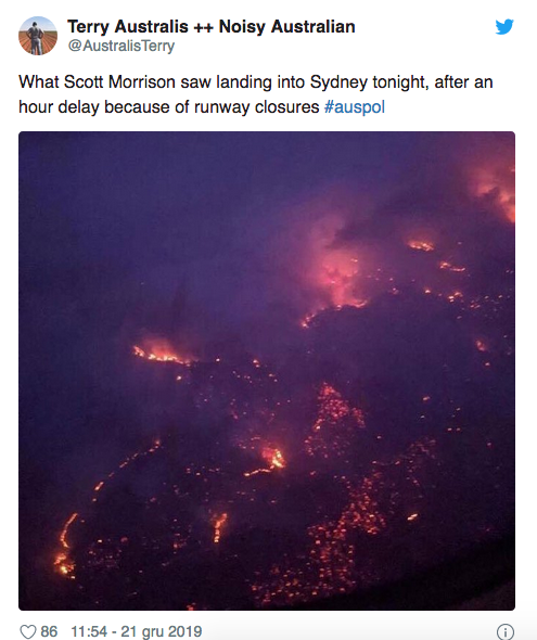 Prawicowy premier Scott Morrison (zaprzeczający do tej pory zmianom klimatu), przerwał wakacje na Hawajach i wrócił do Sydney. Nieobecność Morrisona w czasie kryzysu wywołała oburzenie społeczeństwa. Jeden z użytkowników Twittera opublikował zdjęcie pokazujące z góry płomienie wokół Sydney.