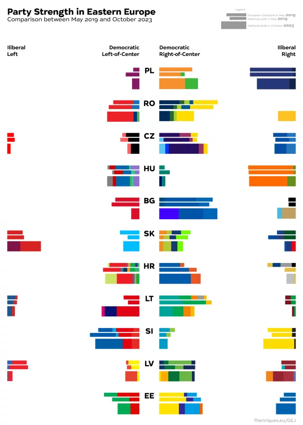 Jednak w przeciwieństwie do dominującej narracji, większość nieliberalnych partii w Europie Wschodniej nie radzi sobie najlepiej. Wartymi wspomnienia wyjątkami są Rumunia, gdzie skrajnie prawicowy AUR odnotowuje wyniki w sondażach na poziomie około 20%, oraz Łotwa, gdzie etniczna rosyjska nieliberalna Lewica dołączyła do etnicznego Łotewskiego Sojuszu Narodowego sytuowanego na skrajnej prawicy.