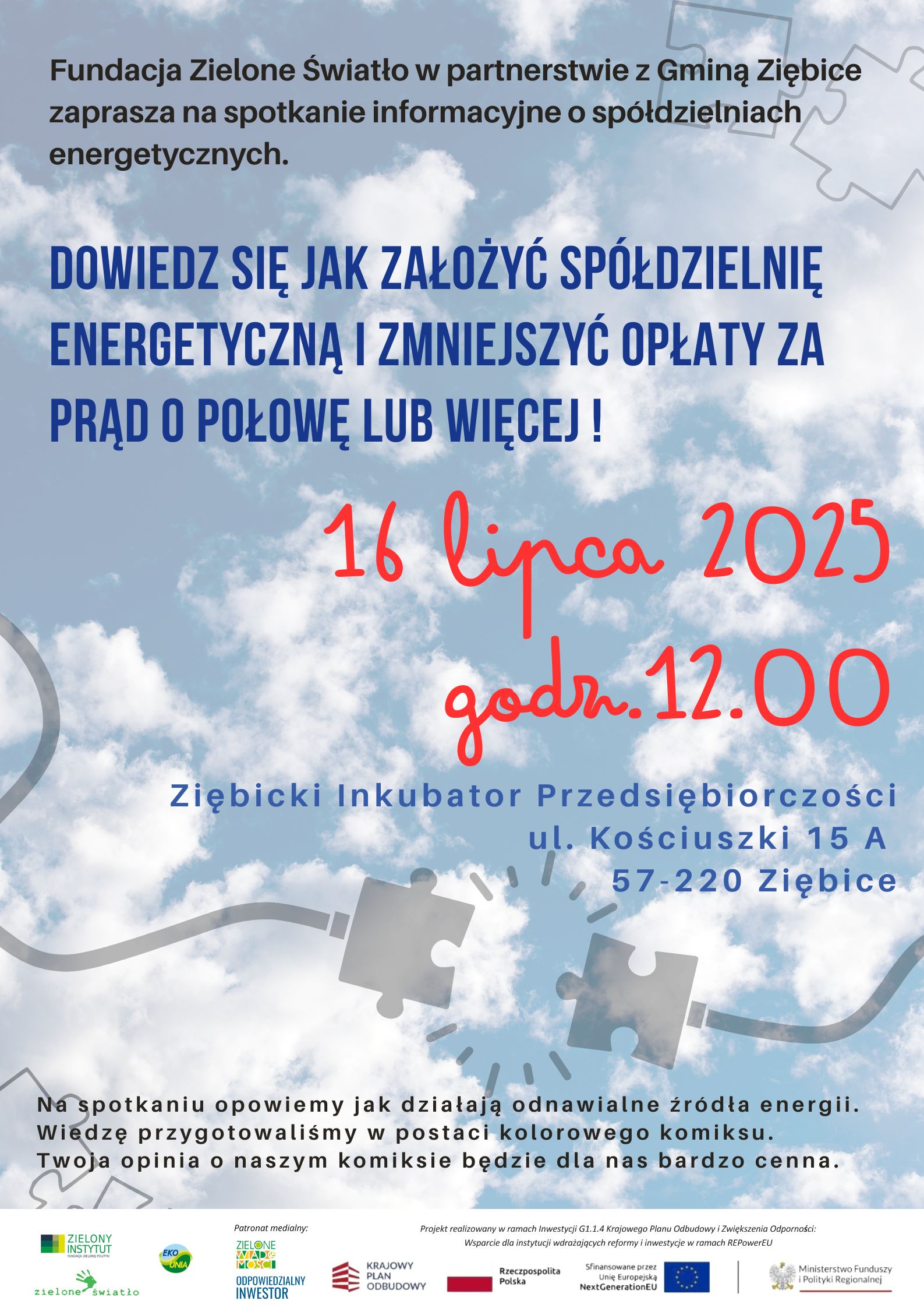 Już 16 lipca 2025 roku w Ziębickim Inkubatorze Przedsiębiorczości odbędzie się wyjątkowe spotkanie informacyjne poświęcone spółdzielniom energetycznym. Wydarzenie organizowane jest przez Fundację Zielone Światło we współpracy z Gminą Ziębice. Początek o godzinie 12:00.