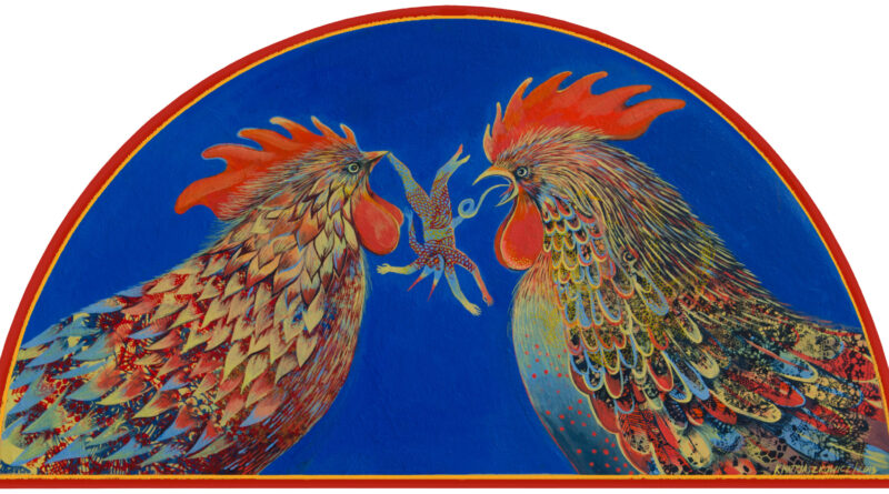 Ja mam zupełnie inny przykład, ale też pokazujący zakradanie się znaczeń przenoszonych przez ptaki. Karolina Matyjaszkowicz, która maluje motywy inspirowane kulturą ludową regionu łowickiego, gdzie się wychowała i gdzie mieszka, często maluje ludowe zaświaty, postaci z legend, z pogranicza rzeczywistości materialnych i wyobraźni. Bywają to ptaki niesamowite, pół-ptaki pół-postaci ludzkie, ptaki bajkowe, bażanty, gołąbki, łowickie pelikany – uwielbiam wszystkie. Moja pochodząca z Łowicza babcia Weronika opowiadała mi w dzieciństwie bajki zamieszkane przez takie ptaki. Ale Karolina maluje też ptactwo domowe, przez mieszczuchów często uważane za niezbyt inteligentne albo co najmniej strasznie zwykłe, banalne. Kurki i kogutki Matyjaszkowicz są jednocześnie zwykłe jak i niesamowite. Dwa kogutki walczą ze sobą któremu dostanie się tłusty czort w charakterze smakołyku. Kurki i kogutki tańczą wokół rajskiego drzewa, towarzyszą boginkom na ukwieconych łąkach… Tak, zdecydowanie – różne rzeczywistości mogą współistnieć dzięki ptakom w sztuce!