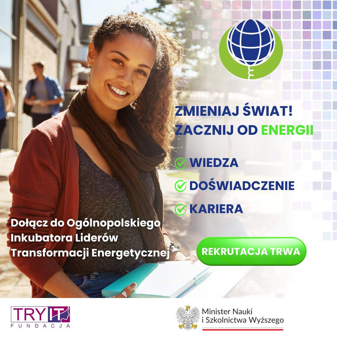 Ogólnopolski inkubator liderów transformacji energetycznej” jest zadaniem publicznym współfinansowanym ze środków otrzymanych w 2025 r. od Ministra Nauki i Szkolnictwa Wyższego w ramach konkursu „Organizowanie i animowanie działań na rzecz środowiska akademickiego.