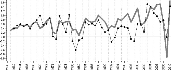 Wreszcie, nawet jeśli niektóre z podanych wyżej argumentów wymagałyby zniuansowania i dalszej dyskusji, w praktyce okazuje się, że większość napędów stymulujących wzrost PKB już nie działa, za czym stoi ewolucja samego wzrostu. Średni wzrost dla krajów UE w latach 60. wyniósł 4,8%, następnie w latach 70. spadł do 3,4%, w latach 80. do 2,3%, a w latach 90. do 2%, podczas gdy w dekadzie po r. 2000 wyniósł 1,5% (kalkulacje własne na podstawie danych Banku Światowego). Ten ogólny trend potwierdza większość prognoz, nawet prognozy Komisji Europejskiej, które przewidują, że wzrost w najbliższych dziesięcioleciach wyniesie od 1 do 1,5%. Dlaczego więc, skoro rozpoznajemy ten nieuchronny trend niskiego/zerowego wzrostu, nadal opieramy naszą przyszłość na scenariuszach, które zakładają poziom wzrostu niespotykany od dziesięcioleci? Złote lata sześćdziesiąte to odległa przeszłość, której powrót jakoś się nie zapowiada.