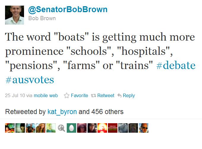Najbardziej skutecznym użyciem Twittera podczas kampanii było włączenie się senatora Boba Browna w „debatę liderów”, z udziałem Julii Gillard i Tony’ego Abbotta. Po tygodniach bezskutecznej kampanii, mającej skłonić główne partie, aby dopuściły Boba do dyskusji, postanowiliśmy posłużyć się wybiegiem. Dzięki użyciu Twittera wypowiedzi lidera Zielonych nie tylko przebiły się do debaty, ale stały się w niej ważnym głosem. Transmitujące debatę stacje telewizyjne pokazywały na pasku informacyjnym komentarze użytkowników Twittera, zaś najczęściej „retweetowaną” wypowiedzią tego wieczoru był komentarz Boba do straszenia przez Gillard i Abbotta imigrantami (boat people): „Słowo «łódki» (boats) zajmuje znacznie więcej miejsca niż «szkoły», «szpitale», «emerytury», «rolnictwo» czy «kolej»”.